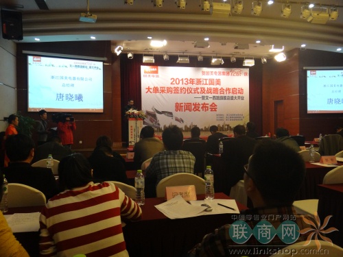 聯(lián)商網(wǎng)消息:11月20日下午,“2013年浙江國美大單采購簽約儀式及戰(zhàn)略合作啟動暨文一西路旗艦店盛大開業(yè)新聞發(fā)布會”在中豪大酒店盛大舉行。省商貿(mào)協(xié)會會長吳德隆,秘書長魏君聰,浙江國美電器分公司領(lǐng)導(dǎo)、各知名廠商代表以及杭城各媒體參與了此次發(fā)布會。