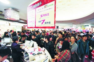 昨天零點(diǎn)剛過,新世界綜合館里響起了最新神曲“江南style”。不過動(dòng)感舞曲成了徹底的配角,人聲鼎沸間或許要豎起耳朵才能聽清旋律。一層的鞋區(qū)內(nèi),不少導(dǎo)購員們甚至站上了商品臺,高舉著自家的折扣促銷標(biāo)牌,在人潮洶涌中賣力地吆喝著。
