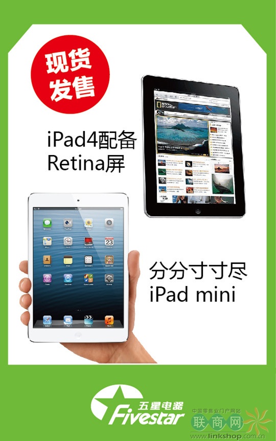聯(lián)商網(wǎng)消息:果粉們盼望已久的蘋果iPad mini和iPad 4將于12月7日(本周五)正式登陸內(nèi)地市場。五星電器今日宣布將與蘋果(中國)一起在全國首銷。五星電器38家蘋果授權(quán)零售店本周五起將提供真機(jī)體驗(yàn),消費(fèi)者可來五星盡情試玩、購買。iPad mini 2498元起售,iPad 4 3688元起售。消費(fèi)者到五星電器預(yù)約購買即加贈(zèng)價(jià)值99元的屏幕貼膜。