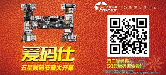 本周五起,五星電器2012數(shù)碼節(jié)同時(shí)盛大開幕,推出“愛碼仕”大型促銷活動(dòng)。消費(fèi)者掃五星電器活動(dòng)二維碼可得50元現(xiàn)金優(yōu)惠券,購數(shù)碼產(chǎn)品滿1500元即可在成交價(jià)基礎(chǔ)上抵用,蘋果數(shù)碼產(chǎn)品亦參加活動(dòng)。消費(fèi)者可通過五星電器官方微博、官網(wǎng)、DM單頁、報(bào)紙廣告等多種途徑獲得活動(dòng)二維碼。