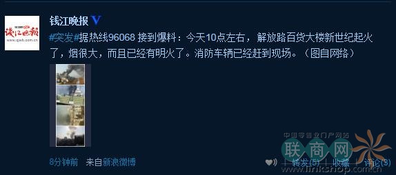 杭州延安路老解百主樓突發(fā)大火 來源: 聯(lián)商網(wǎng) 2012-12-06 10:38 聯(lián)商網(wǎng)快訊:杭州延安路老解百樓頂發(fā)生火災(zāi),目前火勢明顯,已經(jīng)有消防車趕到現(xiàn)場施救。 從消防那了解到:是杭州解百主樓的樓頂鍋爐著火,去了三個中隊十三輛車,目前火勢已控制。 。╲ia新浪微博)