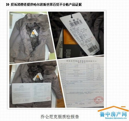 12月3日,記者接到消費(fèi)者葛先生投訴,稱其于11月于哈爾濱新世界百貨購買的多款知名品牌服裝經(jīng)過國家皮革制品質(zhì)量監(jiān)督檢驗(yàn)中心鑒定為不合格產(chǎn)品。其中包含喬倫尼克服、喬倫尼克服、潤闊皮草大衣等,據(jù)了解,經(jīng)檢測(cè)不合格產(chǎn)品單價(jià)均不低于千元。有的甚至超過萬元。不僅如此,投訴者葛先生還表示,因?yàn)椴唤邮苓@樣的結(jié)果,所以在朋友的牽線下請(qǐng)“維權(quán)衛(wèi)士”職業(yè)打假人紀(jì)萬昌幫忙維權(quán),提出要求哈爾濱新世界百貨賠償,然卻遭到哈爾濱新世界白百貨馮經(jīng)理(045153677055該馮小姐本人說代表哈爾濱新世界)的拒絕。據(jù)悉,馮小姐對(duì)于新世界銷售產(chǎn)品為不合格產(chǎn)品的檢測(cè)并無否認(rèn),只表示愿意退貨,拒絕賠償,并叫囂消費(fèi)者“愛到哪告到哪告”。