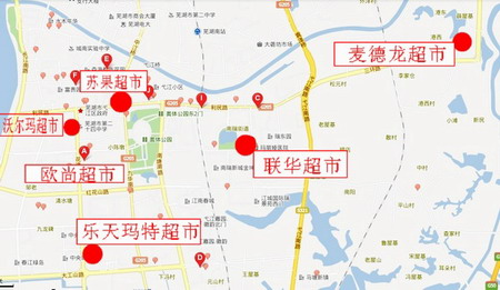 目前,城南共有五大超市,分別是華潤蘇果超市、沃爾瑪超市、歐尚超市、樂天瑪特超市以及聯(lián)華超市。這五大超市間的距離非常近,最遠的距離不足3公里, 最近的有半公里。其中,僅花津南路上就有三家超市,從北到南有沃爾瑪超市、歐尚超市、樂天瑪特超市,每個超市之間的間隔不到3公里。而另外兩個超市華潤蘇果超市和聯(lián)華超市則分布在奧體公園的兩側(cè)。