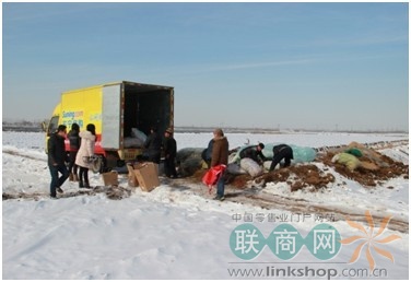 司慶的前一天,濟(jì)南蘇寧電器的陽(yáng)光“1+1”社工志愿者與《生活幫》欄目組人員來(lái)到濰坊市青州市高柳鎮(zhèn)的一個(gè)偏僻小村莊,志愿者們與當(dāng)?shù)卮迕褚黄鸢崖裨诜e雪下面的蔬菜搬到蘇寧愛心車上。雖然雪后的氣溫有零下十幾度,風(fēng)也比較大,但是蘇寧社工志愿者依然積極的在田地和愛心車之間忙碌著,一個(gè)多小時(shí)的時(shí)間就把7000多斤的蘿卜、芹菜裝載到了愛心車上。村支書王愛東說(shuō):“我們都非常感謝濟(jì)南蘇寧電器的工作人員在這么冷的時(shí)候來(lái)到我們村采購(gòu)蔬菜。今年由于大雪和氣溫低,蔬菜很難賣出去,村里收獲的蔬菜都面臨著被凍壞的危險(xiǎn),那對(duì)我們來(lái)說(shuō)損失就大了,F(xiàn)在蘇寧電器工作人員親自開車來(lái)我們村莊收購(gòu)蔬菜,解決了我們賣菜難的問題,讓我們也可以過(guò)個(gè)好年,我們都非常感激。”