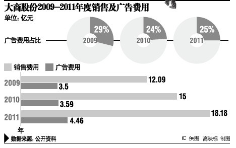 大商股份以上這些費用支出,也遠高于同行。以同體量的重慶百貨為例,其2011年銷售費用為22.2億元,其中廣告費用為1719萬元,廣告費用所占銷售費用比不到1%。