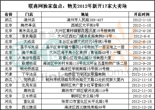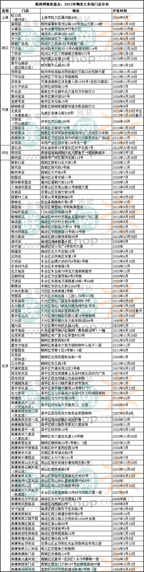 聯(lián)商網(wǎng)編輯根據(jù)物美官方網(wǎng)站及媒體報道綜合整理,2012年物美在內(nèi)地新開17家大賣場,其中北京12家,河北2家,浙江2家,天津1家。具體分布如下: