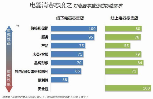 五星電器和TNS在消費(fèi)者對(duì)電器零售店的功能需求調(diào)研時(shí)也發(fā)現(xiàn),無(wú)論選擇實(shí)體零售店還是網(wǎng)上零售店,消費(fèi)者都非常重視服務(wù),希望商家提供正品行貨,有良好的口碑,提供48小時(shí)/快速維修服務(wù),無(wú)條件退換貨,提供延長(zhǎng)質(zhì)保期服務(wù),有專門的部門接受投訴,快速反饋。略有不同的是,消費(fèi)者希望實(shí)體店提供更多高性價(jià)比商品,明碼實(shí)價(jià)。希望網(wǎng)上零售店促銷活動(dòng)要真實(shí),能夠保障賬戶安全性,有方便的退貨服務(wù),能及時(shí)返還退貨錢款。