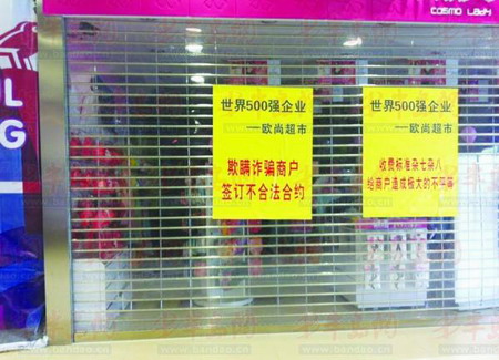 5月8日上午市民周女士興沖沖地去逛歐尚超市,想給4歲的小孫子買幾件夏天穿的衣服,沒想到到了超市后發(fā)現(xiàn),自己喜歡的那家童裝店竟然沒有營(yíng)業(yè)。“我走了一圈發(fā)現(xiàn),好多家商鋪都沒有營(yíng)業(yè),我看門上還都貼著‘歐尚超市欺騙人’之類的標(biāo)語(yǔ)。”周女士說,“大白天的商家不營(yíng)業(yè)這太不正常了,不知道出了什么事兒。”