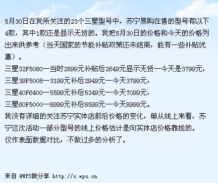 5月30日三星39F5008價格為3199元,節(jié)能補貼價格為2949元,6月8日價格調(diào)整為3799元;