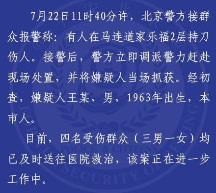7月22日11時(shí)40分許,北京警方接群眾報(bào)警稱(chēng):有人在馬連道家樂(lè)福2層持刀傷人。接警后,警方立即調(diào)派警力趕赴現(xiàn)場(chǎng)處置,并將嫌疑人當(dāng)場(chǎng)抓獲。經(jīng)初查,嫌疑人王某,男,1963年出生,本市人。