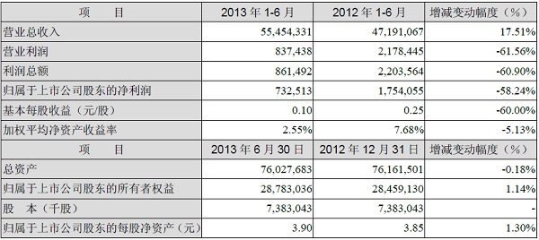 聯(lián)商網(wǎng)消息:7月30日晚間,蘇寧云商發(fā)布2013年半年度業(yè)績快報,上半年公司實現(xiàn)營業(yè)總收入554.54億元,同比增長17.51%;歸屬于上市公司股東的凈利潤7.33億元,同比下降58.24%;基本每股收益0.1元。