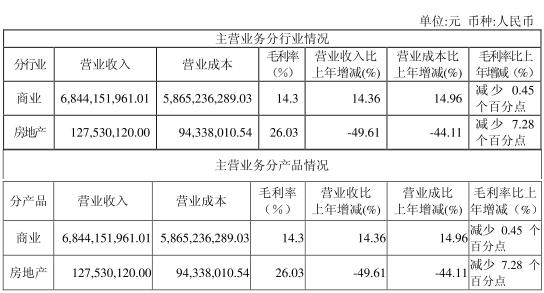 報(bào)告期內(nèi)公司商業(yè)營業(yè)收入71.39億元,比上年同期增長14.65%;房地產(chǎn)業(yè)營業(yè)收入1.28億元,比上年同期下降49.61%,房地產(chǎn)業(yè)的主營業(yè)務(wù)利潤3319萬元,較同期減少60.62%。