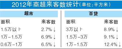報告顯示,去年超市樣本店鋪的日均客單價雖然有所上升,但來客數(shù)并未增加。1.5萬平方米以上、1萬-1.5萬平方米,以及0.6萬-1萬平方米三種體量的超市來客數(shù)分別下降了2.7%、6.9%和6.5%;百貨店來客數(shù)同樣出現(xiàn)了下降,1萬-1.5萬平方米、1.5萬-3萬平方米,以及3萬平方米以上三種體量的店鋪來客數(shù)分別下降了12.4%、9.1%和8.9%。