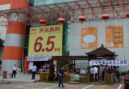 9月1日上午,裝飾建材零售商百安居?xùn)|莞店的員工在百安居第一國(guó)際店門前拉起橫幅,抗議公司新出臺(tái)的薪資政策。