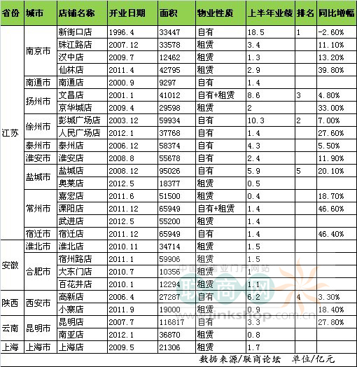 聯(lián)商網(wǎng)消息:近日,聯(lián)商網(wǎng)論壇流出了一份金鷹商貿(mào)2013年上半年各分店業(yè)績榜單(以下簡稱“榜單”,經(jīng)核算各門店銷售總額數(shù)與金鷹商貿(mào)中期年報紕漏數(shù)字相符)。榜單顯示,金鷹商貿(mào)業(yè)績前五的門店分別為,南京新街口店、徐州彭城廣場店、揚(yáng)州文昌店、西安高新店、江蘇鹽城店;其中單店業(yè)績最高為南京新街口店,達(dá)18.5億,同店銷售漲幅最高為常州溧陽店,達(dá)46.6%。