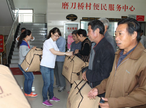 圖為超市員工向?yàn)?zāi)民發(fā)放冬被