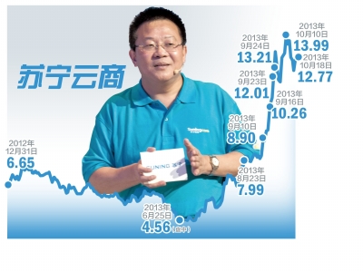 但是,今年下半年以來,蘇寧相繼拿到了基金支付結算牌照、商業(yè)保理牌照,隨著蘇寧申請籌辦銀行的消息傳出,蘇寧股價開始進入飆升模式。8月23日,蘇寧發(fā)布公告確認已向有關部門遞交設立銀行的初步意向方案,蘇寧股價隨即大漲,并且在9月10日、9月16日、9月23日、9月24日四度漲停。蘇寧最新的股價是10月18日收盤價每股12.77元,也就是說在不到4個月的時間里,蘇寧的股價從最低谷的不到5塊錢飆升至現在的12塊多,成功實現翻番。