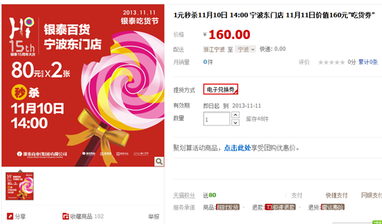 另外,除線下外,線上的活動也在今天開始開搶。從今天上午9點-11月11日中午12點,通過天貓平臺“銀泰百貨精品旗艦店”進行一元秒殺,秒殺成功即可去銀泰體驗兩人免單。記者通過天貓頁面了解到,許多門店的“吃貨券”已經(jīng)被一搶而空。銀泰百貨寧波東門店的“吃貨券”將于明天(11月10日)14:00準(zhǔn)時開搶。