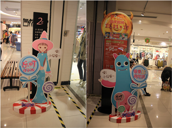 (店內(nèi)充滿了15周年店慶的海報以及“小怪獸”)