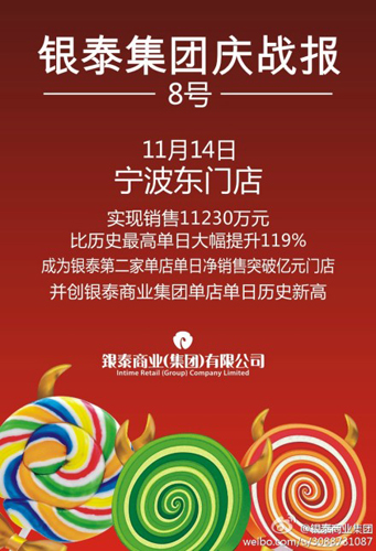 聯商網消息:11月15日,銀泰集團發(fā)布了寧波地區(qū)各銀泰門店14日單日純銷售額情況。