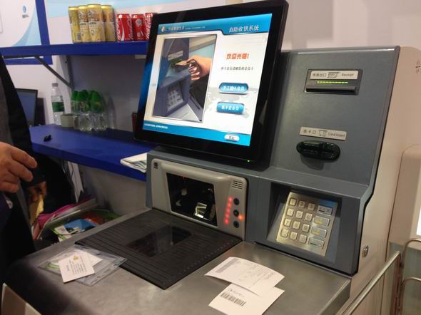 聯(lián)商網(wǎng)消息:由國內(nèi)設(shè)計組裝的首臺全自助收銀設(shè)備亮相連鎖店展覽會,實現(xiàn)商品自助掃描、會員卡輸入、多種支付方式結(jié)算(現(xiàn)金、儲值卡、銀行卡)、小票打印等功能,售價在七萬元左右;