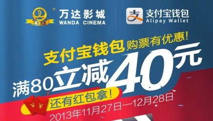 聯(lián)商網(wǎng)消息:隨著電商逐漸被關(guān)注,線上與線下的聯(lián)系也越來越頻繁。記者從萬達(dá)電影生活新浪官方微博獲悉,繼與銀泰、打車聯(lián)手后,近日支付寶又與萬達(dá)電影網(wǎng)聯(lián)手,打造賀歲優(yōu)惠。凡支付寶付款單筆訂單滿80元就可以減40元,使用支付寶聲波取票,更可以獲得20元萬達(dá)電影代金券。
