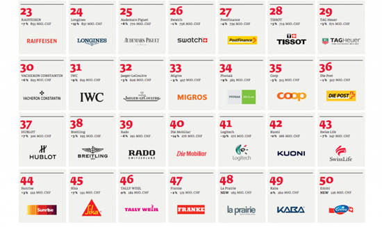 根據(jù)Interbrand 公布的“2013年最佳瑞士品牌”,前50大瑞士品牌中的16個都是鐘表品牌。