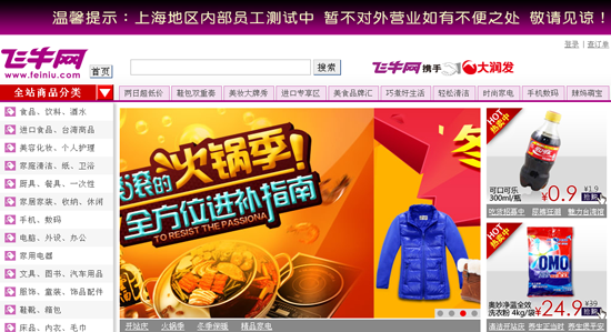 聯(lián)商網(wǎng)消息:12月27日,原計(jì)劃11月底、12月初正式上線的大潤(rùn)發(fā)電商“飛牛網(wǎng)”并沒有如期上線。聯(lián)商網(wǎng)記者登錄飛牛網(wǎng)頁(yè)面,發(fā)現(xiàn)網(wǎng)頁(yè)雖然可以打開,但暫時(shí)不對(duì)外營(yíng)業(yè),溫馨提示為:上海地區(qū)內(nèi)部員工測(cè)試中。據(jù)相關(guān)人員透露,飛牛網(wǎng)昨日起針對(duì)內(nèi)部員工進(jìn)行試營(yíng)業(yè),目前,全面推出的時(shí)間還沒正式確定,預(yù)計(jì)為年后或明年1月中旬。