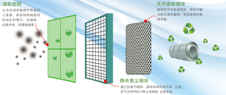 靜電集塵模塊,負離子主動吸附、強電場凈化, PM2.5去除率高達99.9%、病菌去除率高達97.76%。清新網(wǎng)能有效抑制細菌滋生、繁衍,對病原菌以及流感病毒有效抑制、滅殺,保障健康持續(xù)高效。天然晶碳模塊,吸附空氣中甲醛,結晶分解將甲醛合成無害結晶物,去除率高于99%;吸附空氣中苯,分解為無害的Co2和H2o,去除率高于98%;強力消除異味,吸附固化分解,去除率高于97%,有效避免了二次污染。