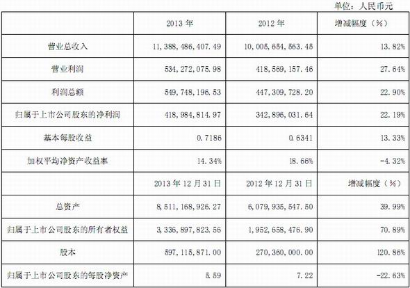 2013年公司財(cái)務(wù)狀況與經(jīng)營(yíng)業(yè)績(jī)良好。報(bào)告期期末總資產(chǎn)85.11億元,較年初增長(zhǎng)39.99%;報(bào)告期營(yíng)業(yè)收入113.89億元,同比增長(zhǎng)13.82%;凈利潤(rùn)4.19億元,同比增長(zhǎng)22.19%;加權(quán)平均凈資產(chǎn)收益率14.34%,同比下降4.32個(gè)百分點(diǎn)。