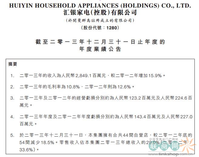 聯(lián)商網(wǎng)消息:匯銀家電日前發(fā)布2013年業(yè)績公告,公告顯示,2013年的收入為人民幣28.49億元,較2012年增加15.9%。2013年度的毛利率為10.8%,2012則為12.6%。2013和2012年的經(jīng)營虧損分別約為人民幣1.232億元及人民幣2.246億元。2013年度和2012年度虧損分別約為人民幣1.434億元及人民幣2.27億。截止2013年12月31日,集團(tuán)擁有合共44 間自營店,較2012年底的54間減少18.5%。零售收入占集團(tuán)2013總收入的29.0%(2012年為: 33.6%)。