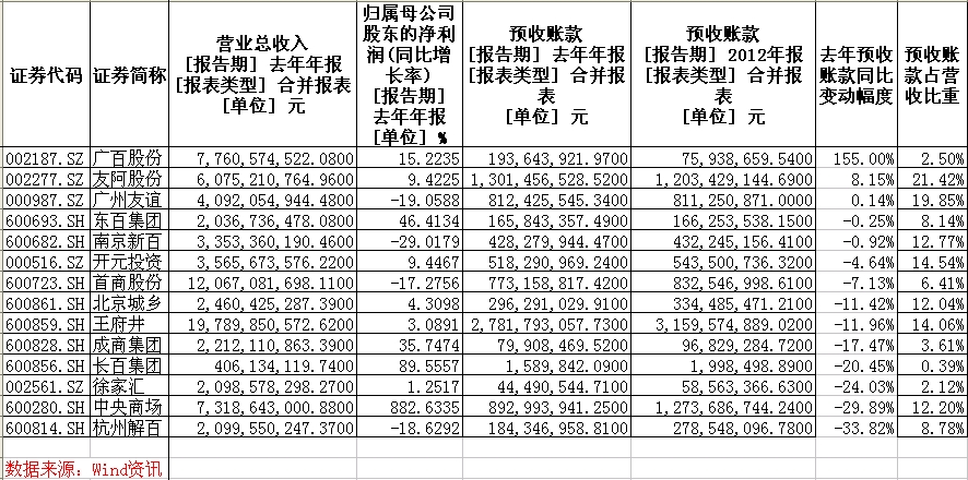 根據WIND資訊金融終端提供的數據,目前已經披露年報的14家百貨上市公司中,2013年末公司預收賬款同比下降的公司有11家,占比78.57%。其中,預收賬款同比降幅超過10%的上市公司有7家,占到已公布年報百貨上市公司的一半。