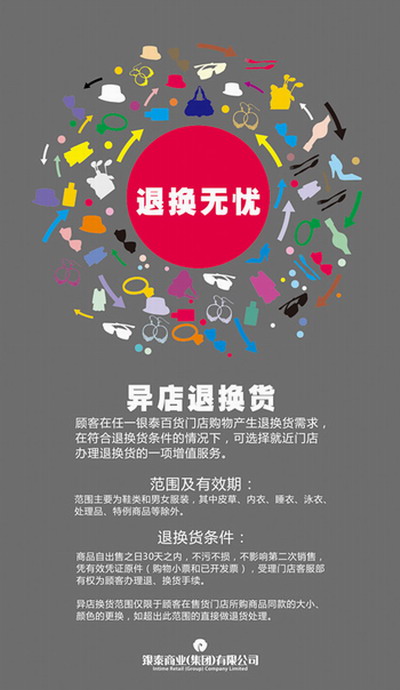 其中,異店換貨范圍僅限于顧客在售貨門店所購商品同款的大小、顏色的更換,如超出此范圍的直接做退貨處理。