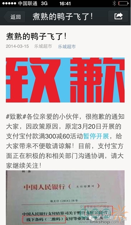再回到之前與支付寶合作促銷而被央行叫停的烏龍事件。經(jīng)過了圍魏救趙的曲線危機公關之后,樂城超市開始以正式的姿態(tài)向消費者道歉,不過它依然把“央行”放在前頭:這事其實錯不在我,而在它!