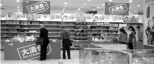 走上二樓賣(mài)場(chǎng)區(qū),近一半的貨架已經(jīng)搬空,幾個(gè)工作人員忙著下架貨品,到處散落著紙箱、垃圾,到處懸掛的紅底白色的“大清倉(cāng)”字樣特別惹眼。因?yàn)轭櫩拖∩,貨物寥寥,賣(mài)場(chǎng)更顯得空曠。人氣比較旺的就是日化用品區(qū),大伯大媽正在搶購(gòu)清倉(cāng)特價(jià)品。