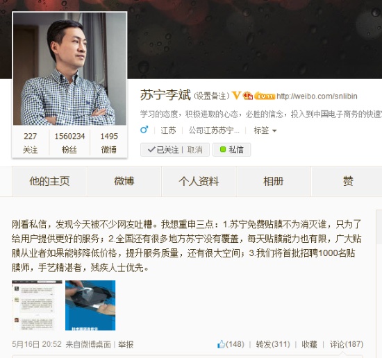 李斌也在微博表示其私信被不少網(wǎng)友吐槽,遂發(fā)布微博澄清:“蘇寧免費貼膜不為消滅誰,只為了給用戶提供更好的服務(wù)”,“全國還有很多地方蘇寧沒有覆蓋,每天貼膜能力也有限,廣大貼膜從業(yè)者如果能夠降低價格、提升服務(wù)質(zhì)量,還有很大空間”。此外,還公布了蘇寧將首批招聘1000名貼膜師的消息。