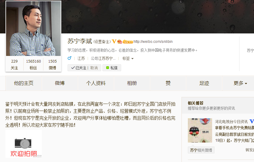 正常情況下,如果有人到商場(chǎng)、超市等商業(yè)場(chǎng)所拍照必然會(huì)遭到阻止,出于商業(yè)機(jī)密保護(hù),商業(yè)場(chǎng)所禁止拍照已經(jīng)成為行業(yè)默認(rèn)規(guī)則。而近日蘇寧云商副總裁李斌宣布開放其全國(guó)門店拍照,并歡迎消費(fèi)者隨手拍分享體驗(yàn)甚至吐槽。