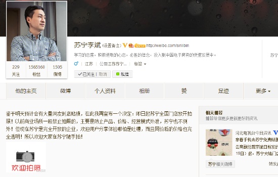 李斌表示,出于對(duì)產(chǎn)品、價(jià)格、經(jīng)營(yíng)模式的保護(hù),商業(yè)場(chǎng)所一般禁止拍照。但是現(xiàn)在蘇寧是完全開放的企業(yè),而且線上蘇寧易購(gòu)和線下門店同價(jià)以來(lái),蘇寧商品價(jià)格已經(jīng)完全透明,加上近日蘇寧在門店推出手機(jī)免費(fèi)貼膜活動(dòng),吸引大量網(wǎng)友到店,因此蘇寧做出開放拍照的決定。