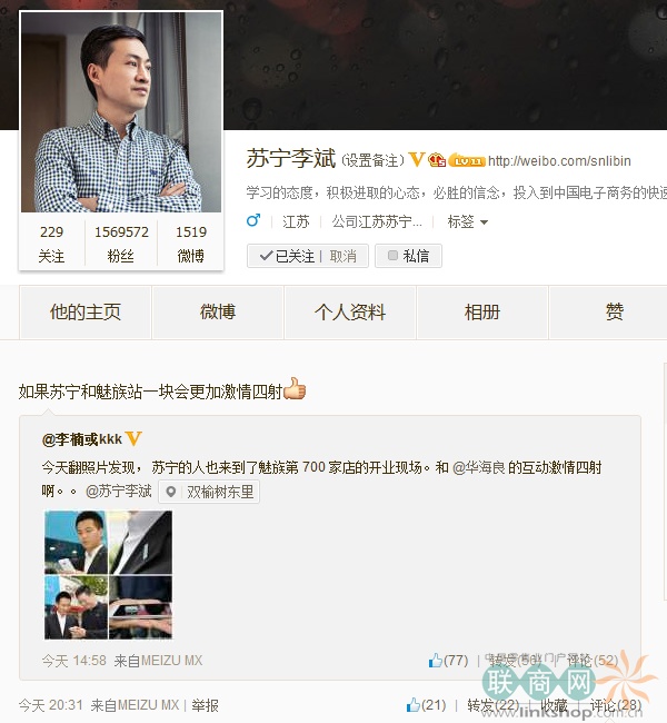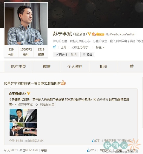 聯(lián)商網(wǎng)消息:5月26日下午3點(diǎn)左右,魅族高級總監(jiān)李楠發(fā)布微博表示“蘇寧的人來到魅族第700家店的開業(yè)現(xiàn)場”,現(xiàn)場互動(dòng)“激情四射”。當(dāng)晚8點(diǎn)半左右,蘇寧副總裁李斌轉(zhuǎn)發(fā)魅族高級總監(jiān)李楠的微博,并表示“如果蘇寧和魅族站一塊會(huì)更加激情四射”。這一舉動(dòng)引發(fā)眾多網(wǎng)友熱議,紛紛猜測蘇寧與魅族的下一步舉措,并高呼讓蘇寧和魅族“在一起”。