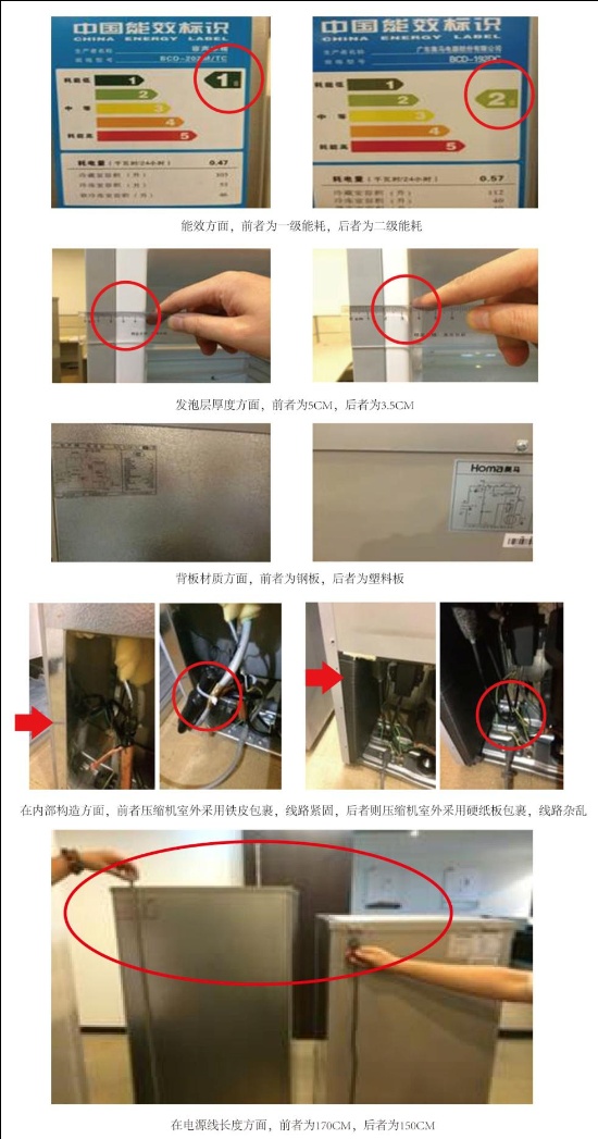 國(guó)美此次著重強(qiáng)調(diào)了體驗(yàn)對(duì)大家電產(chǎn)品選擇的必要性。記者請(qǐng)國(guó)美彩電事業(yè)部、冰箱事業(yè)部負(fù)責(zé)人親自對(duì)比了國(guó)內(nèi)某知名電商平臺(tái)和國(guó)美所銷售的家電商品。首先對(duì)比彩電,兩者為同一品牌、售價(jià)均為2999元的兩款彩電。通過(guò)對(duì)比之后發(fā)現(xiàn),二者之間的品質(zhì)差距非常明顯。尺寸方面,國(guó)美渠道的該款彩電為49吋,而電商專供機(jī)僅為48吋;屏幕方面,國(guó)美銷售的彩電采用進(jìn)口韓國(guó)IPS硬屏,后者則采用普通LED軟屏;底座方面,前者采用鋼化玻璃底座,后者采用塑料底座;功能方面,前者設(shè)有內(nèi)置無(wú)線WIFI、網(wǎng)絡(luò)接口,后者并無(wú)上述功能,非智能網(wǎng)絡(luò)機(jī);最后,在關(guān)鍵的能效方面,前者為二級(jí)能效,后者為三級(jí)能效,后者更耗電。