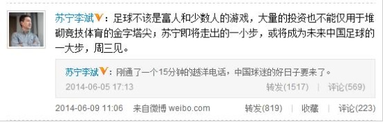 傳聞稱蘇寧即將牽手國外豪門俱樂部巴薩,進(jìn)軍足球行業(yè)。今日蘇寧云商副總裁、運(yùn)營總部執(zhí)行總裁李斌發(fā)布相關(guān)微博表示,“足球不該是富人和少數(shù)人的游戲,大量的投資也不能僅用于堆砌競技體育的金字塔尖;蘇寧即將走出的一小步,或?qū)⒊蔀槲磥碇袊闱虻囊淮蟛,周三?rdquo;。
