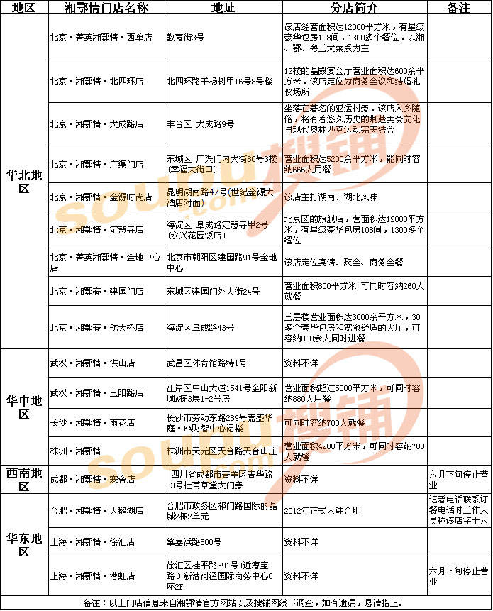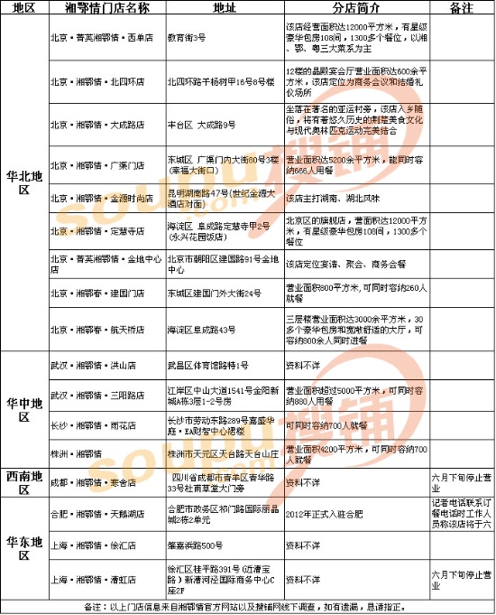 從“雙主業(yè)”戰(zhàn)略可以看出湘鄂情并沒有完全拋棄餐飲業(yè)務(wù),只是在餐飲業(yè)務(wù)之外為了抵御行業(yè)風(fēng)險有選擇性的開辟新業(yè)務(wù)。為此搜鋪網(wǎng)搜集整理截止六月底湘鄂情仍然在營業(yè)的門店以供參考之用。