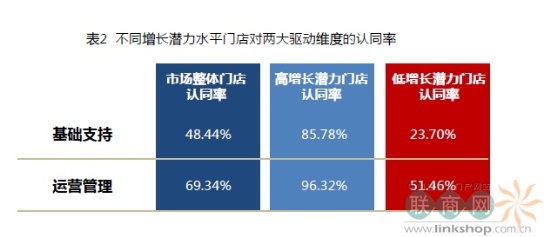 高增長(zhǎng)潛力門(mén)店對(duì)兩大驅(qū)動(dòng)因素的認(rèn)同率超出低增長(zhǎng)潛力門(mén)店40%以上水平