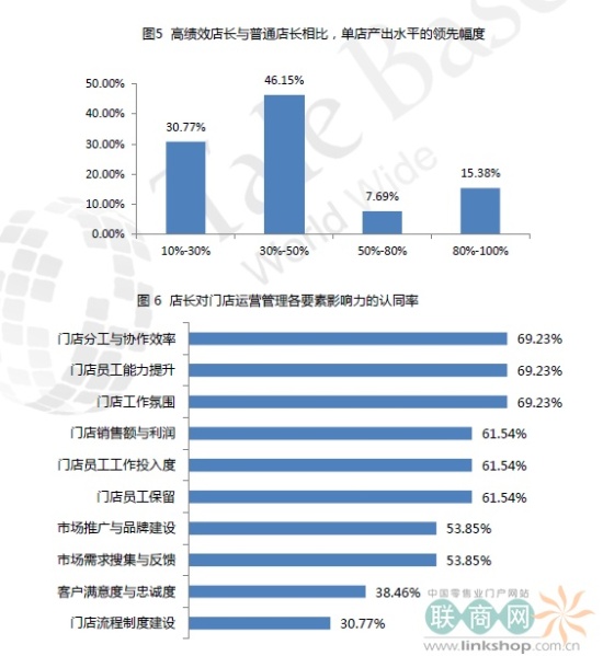 結(jié)合前面對(duì)不同增長(zhǎng)潛力水平門(mén)店的分析發(fā)現(xiàn),高增長(zhǎng)潛力門(mén)店不僅更為理解并認(rèn)可公司的目標(biāo)策略,而且具有更優(yōu)的內(nèi)部運(yùn)營(yíng)管理質(zhì)量。這些均與店長(zhǎng)的能力水平和管理績(jī)效息息相關(guān)。同時(shí),對(duì)于企業(yè)管理者的調(diào)研結(jié)果亦表明,店長(zhǎng)對(duì)于終端運(yùn)營(yíng)具有深遠(yuǎn)的影響。一方面,企業(yè)肯定了店長(zhǎng)績(jī)效水平對(duì)門(mén)店產(chǎn)出水平的影響作用。70%的企業(yè)認(rèn)為,與普通店長(zhǎng)相比,高績(jī)效店長(zhǎng)所在門(mén)店的產(chǎn)出水平高出30%-50%,此外,對(duì)于15.38%的企業(yè)來(lái)說(shuō),這種差距更達(dá)80%以上。另一方面,企業(yè)指出店長(zhǎng)的績(jī)效水平不僅反映在對(duì)門(mén)店業(yè)績(jī)與利潤(rùn)創(chuàng)造的貢獻(xiàn)上,其對(duì)門(mén)店運(yùn)營(yíng)效率、團(tuán)隊(duì)塑造、人員激勵(lì)與保留、市場(chǎng)策略落實(shí)、制度建設(shè)等方面亦發(fā)揮著重要的影響作用。