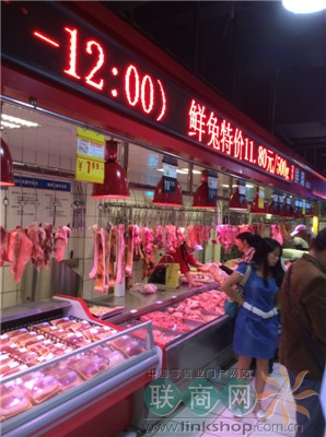 (圖:在LED板上可以看到鮮兔以及其他山珍肉品的特價銷售,地處云貴高原的白云店會售賣一些合乎當?shù)夭惋嬃曀椎耐撂禺a(chǎn),深受當?shù)厝说南矏邸#?/p>