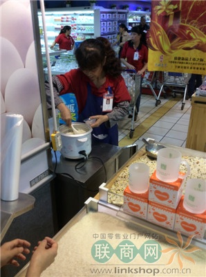 。▓D:精品大米和普通谷類是分區(qū)域陳列的,這是白云店新引進的蟹田米,7.99元/斤,促銷價是5.99元,比泰國香米還高一個檔次。超市還為新品促銷做了個“看世界杯,品蟹田米”的活動,買米還送個亞克力杯,現(xiàn)場有新米的試吃活動。)