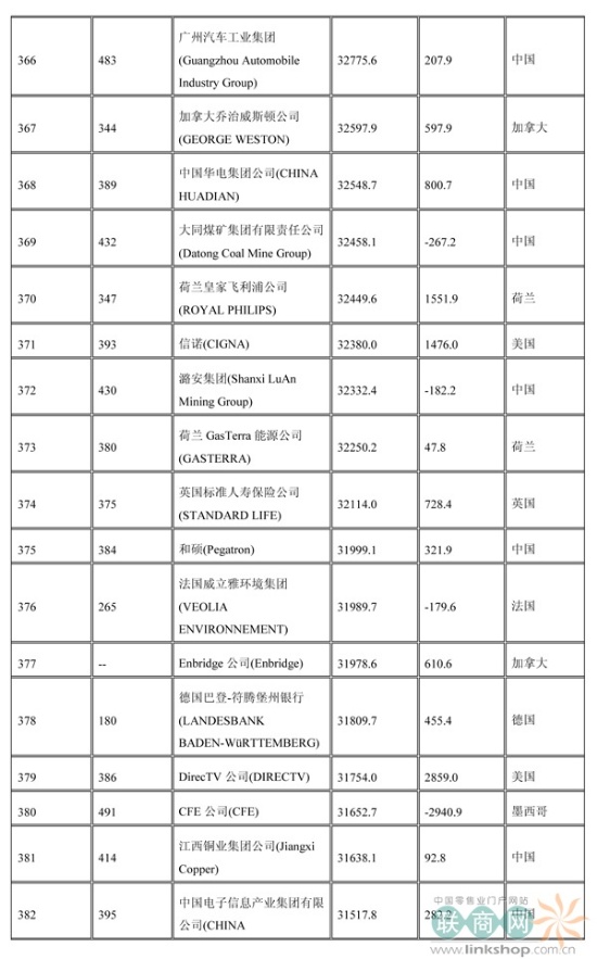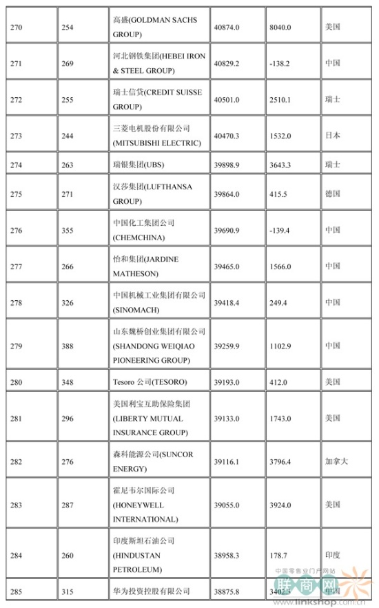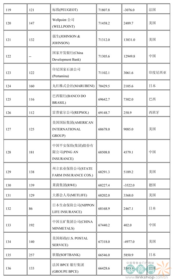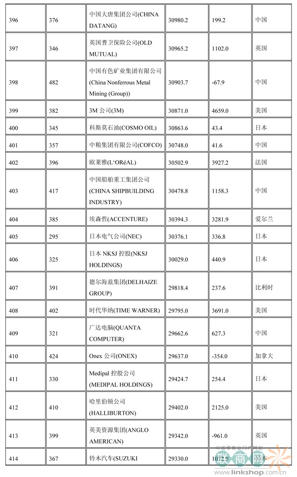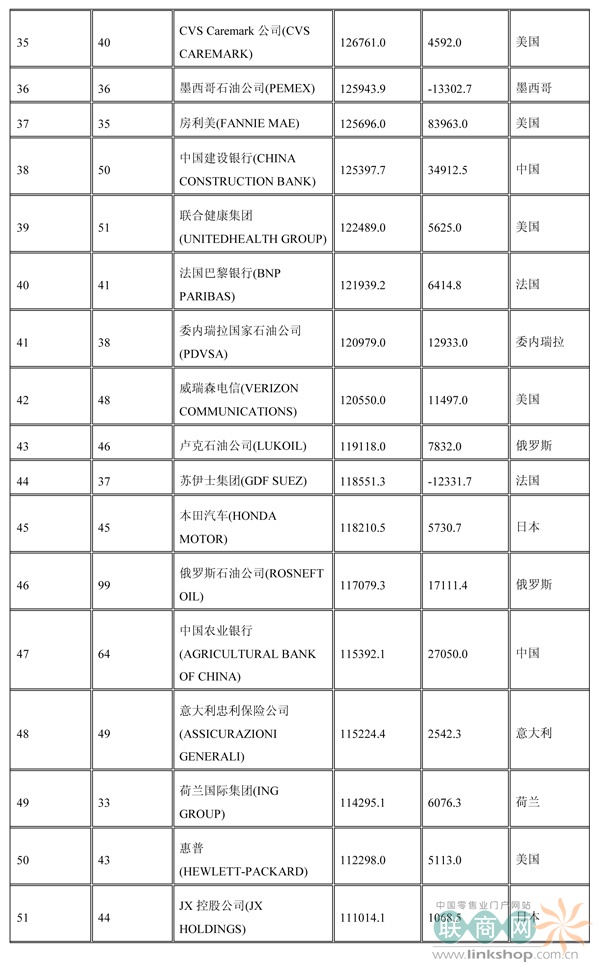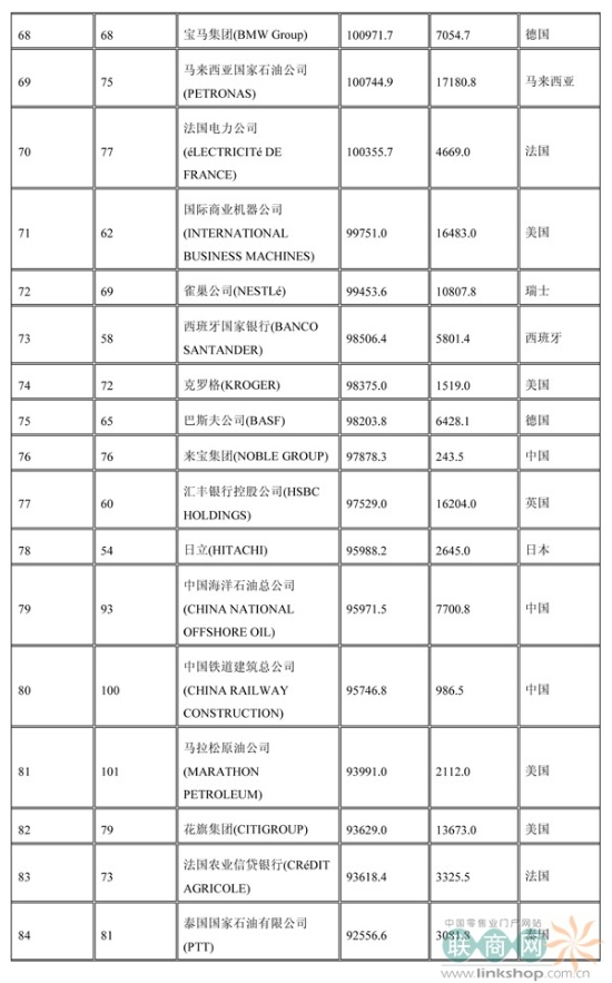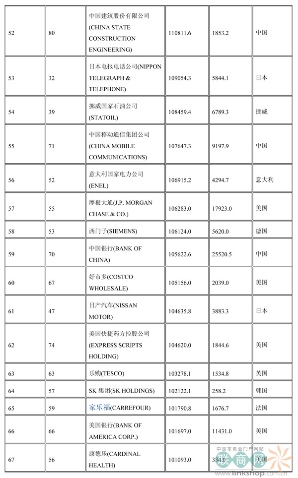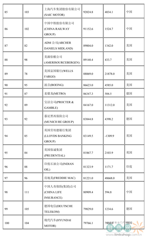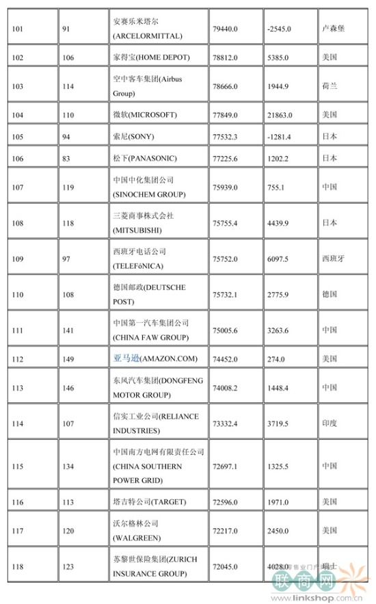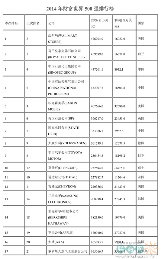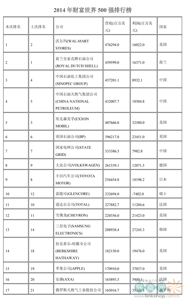 聯(lián)商網(wǎng)消息:北京時(shí)間2014年7月7日晚,財(cái)富中文網(wǎng)全球同步發(fā)布了最新的《財(cái)富》世界500強(qiáng)排行榜,零售業(yè)老大沃爾瑪重回榜首。中國(guó)上榜公司數(shù)量創(chuàng)紀(jì)錄地達(dá)到100家。中石化取代了埃克森美孚,在榜上排名第三,打破了該公司與沃爾瑪和殼牌三足鼎立的歷史。