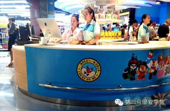 《第三只眼看零售》發(fā)現(xiàn),在樂城第二代賣場播放的視頻、墻壁的裝修、立柱及收銀臺的外包、商品信息標(biāo)牌乃至DM海報(bào)中大量應(yīng)用了《摩爾莊園》主人公形象。一方面,給消費(fèi)者全新的視覺體驗(yàn),在同質(zhì)化競爭激烈的賣場環(huán)境中一種耳目一新的感覺;另一方面,反復(fù)強(qiáng)調(diào)的視覺渲染,加強(qiáng)消費(fèi)者的認(rèn)知度。