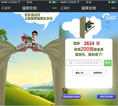 在內(nèi)測(cè)階段,筆者有幸體驗(yàn)了一次《猛降價(jià)到》。簡(jiǎn)單的來(lái)說(shuō),這是一款類(lèi)似于“打企鵝”的擊打類(lèi)游戲,打開(kāi)游戲界面,會(huì)有一個(gè)擊打?qū)ο?mdash;—猛將在天橋上與五星電器的家電顧問(wèn)“小伍”相遇,操作者只需點(diǎn)擊屏幕上的猛將,便可將他輕松打落萬(wàn)米懸崖,獲取現(xiàn)金券。當(dāng)然,現(xiàn)金券的金額得根據(jù)操作者的擊打手法來(lái)哦,通過(guò)不同的角度、擊打不同的部位,都會(huì)出現(xiàn)不一樣的效果。當(dāng)然最終現(xiàn)金券獲得的多少是按照墜落的米數(shù)來(lái)決定的,即猛將墜落的米數(shù)越大,獲得現(xiàn)金券的額度就越高,例如筆者將猛將擊落了2624米,因此成功獲得了200元的現(xiàn)金券。這現(xiàn)金券可用于在國(guó)慶節(jié)期間到五星門(mén)店購(gòu)買(mǎi)家電使用,購(gòu)物滿(mǎn)一定金額,全額直抵現(xiàn)金。