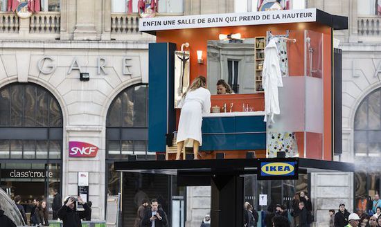 除了這次的攀巖墻,Ubi-bene 之前曾與宜家法國有過數(shù)次合作。如在鬧市區(qū)放置一個宜家盥洗室樣板間,還曾經(jīng)制作過大號尺碼的樣板間,讓置身其中的顧客像是小人國國民的一般。